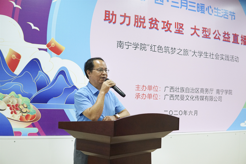 2020年6月3日下午,南寧學(xué)院在大學(xué)生創(chuàng)業(yè)園開展助力脫貧攻堅(jiān)大型公益直播暨南寧學(xué)院“紅色筑夢之旅”社會(huì)實(shí)踐活動(dòng)啟動(dòng)儀式?;顒?dòng)由南寧學(xué)院聯(lián)合廣西壯族自治區(qū)商務(wù)廳共同舉辦。