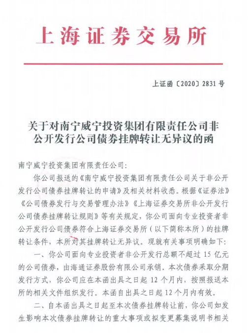 2020年12月17日,集團(tuán)收到上海證券交易所(以下簡稱“上交所”)《關(guān)于對(duì)南寧威寧投資集團(tuán)有限責(zé)任公司非公開發(fā)行公司債券掛牌轉(zhuǎn)讓無異議的函》,成功申報(bào)15億元私募公司債發(fā)行額度。