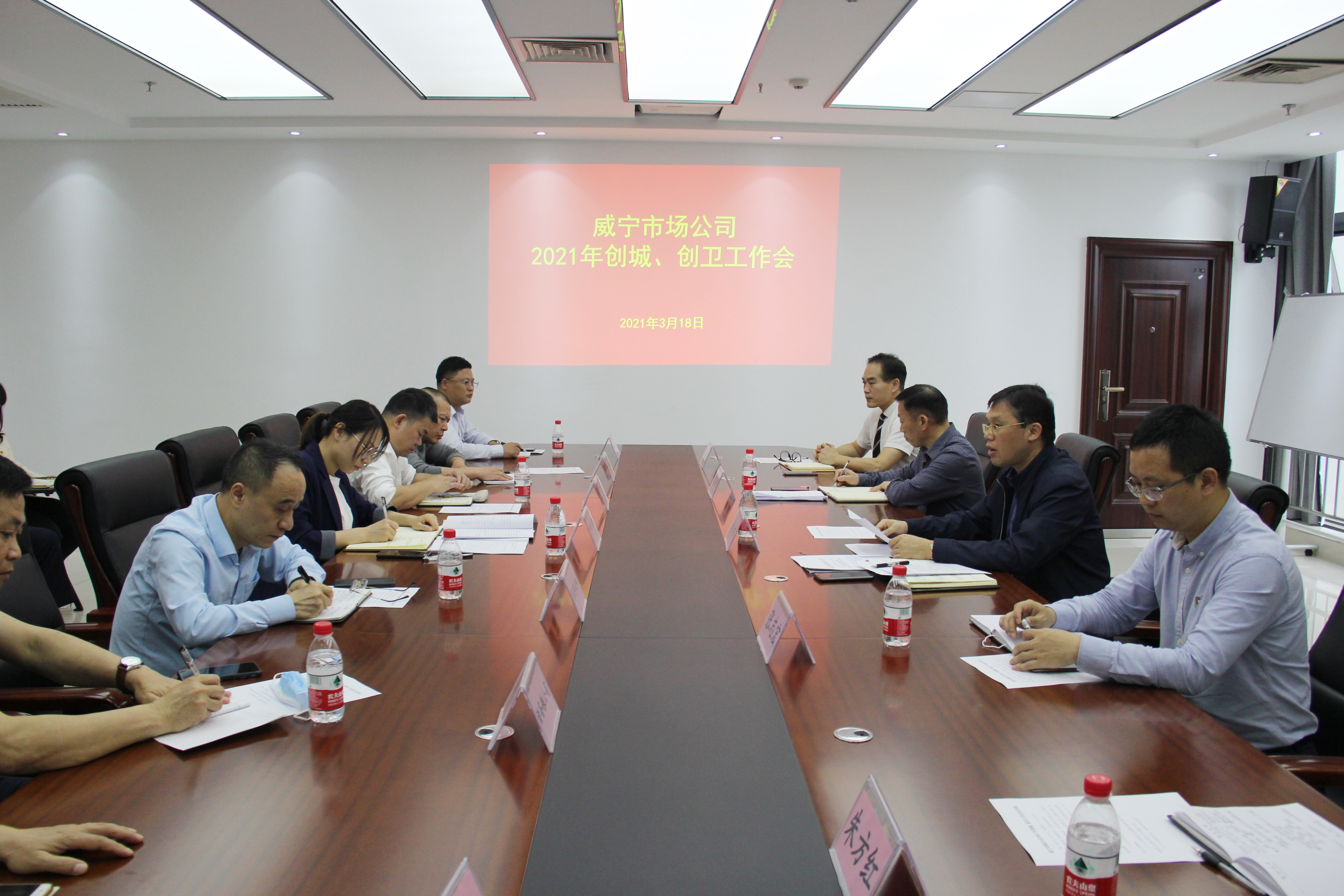 會議現(xiàn)場為推動威寧市場公司“雙創(chuàng)”工作提質(zhì)增效,再上新臺階。2021年3月18日,威寧市場公司召開2021年創(chuàng)衛(wèi)、創(chuàng)城工作會議。公司黨委書記、董事長李林參加會議并講話。會上,公司黨委副書記黃俏仟傳達了市創(chuàng)衛(wèi)辦、南寧威寧集團關(guān)于做好迎接創(chuàng)建國家衛(wèi)生城市省級暗訪工作的通知精神,并就威寧市場公司迎接創(chuàng)衛(wèi)復(fù)審工作方案的目標、重點和要求做了詳細說明。黃俏仟強調(diào),暗訪工作是創(chuàng)建國家衛(wèi)生城市考核的一票否決環(huán)節(jié),