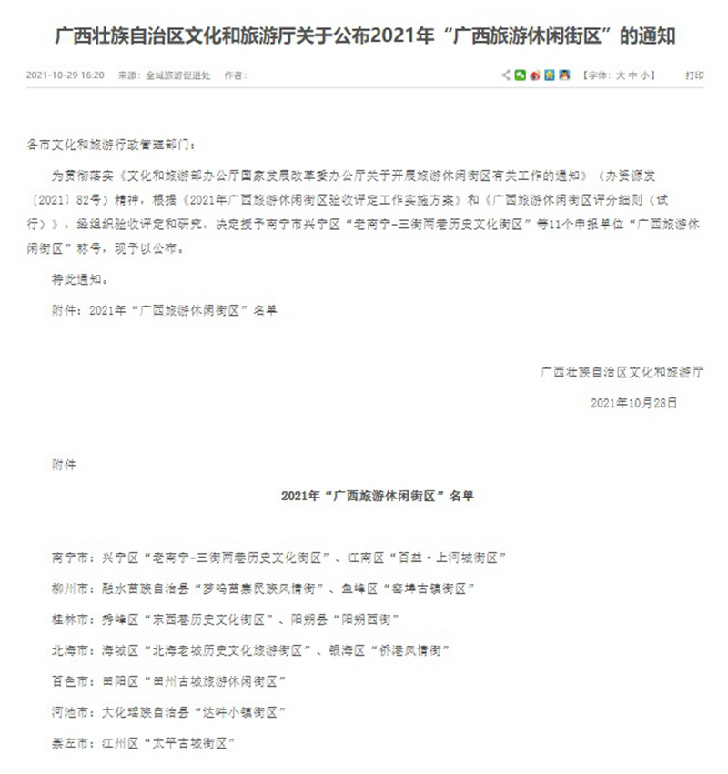近日,廣西壯族自治區(qū)文旅廳公布2021年“廣西旅游休閑街區(qū)”名單,“老南寧·三街兩巷”歷史文化街區(qū)等11個(gè)項(xiàng)目成功入選。