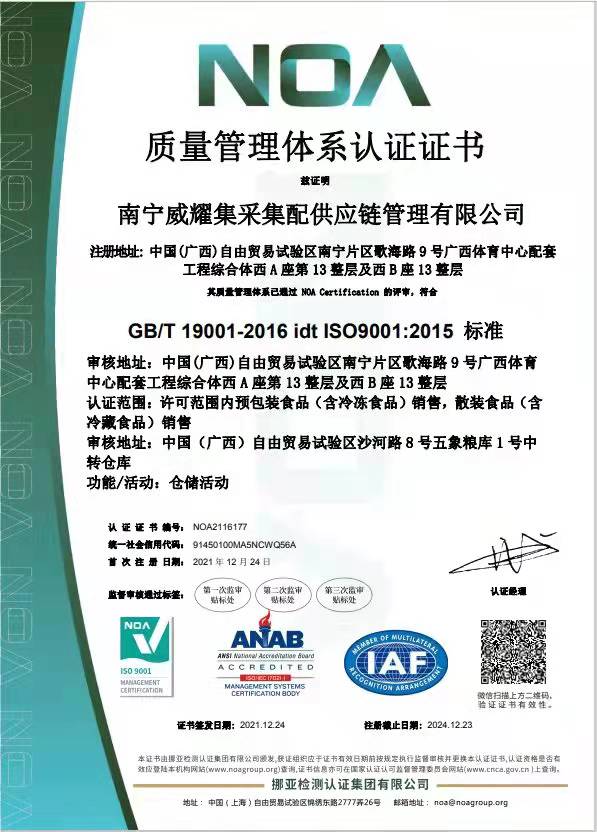 ISO9001質(zhì)量管理體系認(rèn)證圖片ISO14001環(huán)境管理體系認(rèn)證圖片ISO45001職業(yè)健康安全管理體系認(rèn)證圖片2022年1月19日,威耀供應(yīng)鏈公司正式取得ISO9001質(zhì)量管理體系認(rèn)證、ISO14001環(huán)境管理體系認(rèn)證、ISO45001職業(yè)健康安全管理體系認(rèn)證證書。在保障學(xué)校食材配送的過程中,威耀供應(yīng)鏈公司通過建立符合三大認(rèn)證標(biāo)準(zhǔn)的管理體系,助推標(biāo)準(zhǔn)化建設(shè)工作取得階段性成績,為學(xué)校提供安全優(yōu)質(zhì)