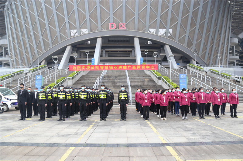 隊(duì)伍展示2022年1月14日上午,威凱智慧物業(yè)正式進(jìn)駐廣西體育中心,從中標(biāo)到入駐僅用了13天,充分顯示了威凱智慧物業(yè)承接項(xiàng)目的實(shí)力與效率。進(jìn)駐儀式在體育中心主體育館D區(qū)前廣場舉行,活動(dòng)現(xiàn)場,威凱智慧物業(yè)公司進(jìn)行了隊(duì)伍、設(shè)備展示,彰顯了威凱物業(yè)高標(biāo)準(zhǔn)、高效率、高品質(zhì)服務(wù)。廣西體育中心總占地2000畝,總建筑面積達(dá)50.8萬平方米。配套包括主體育場、體育館、游泳跳水館以及現(xiàn)代化的網(wǎng)球中心。威凱智慧物業(yè)