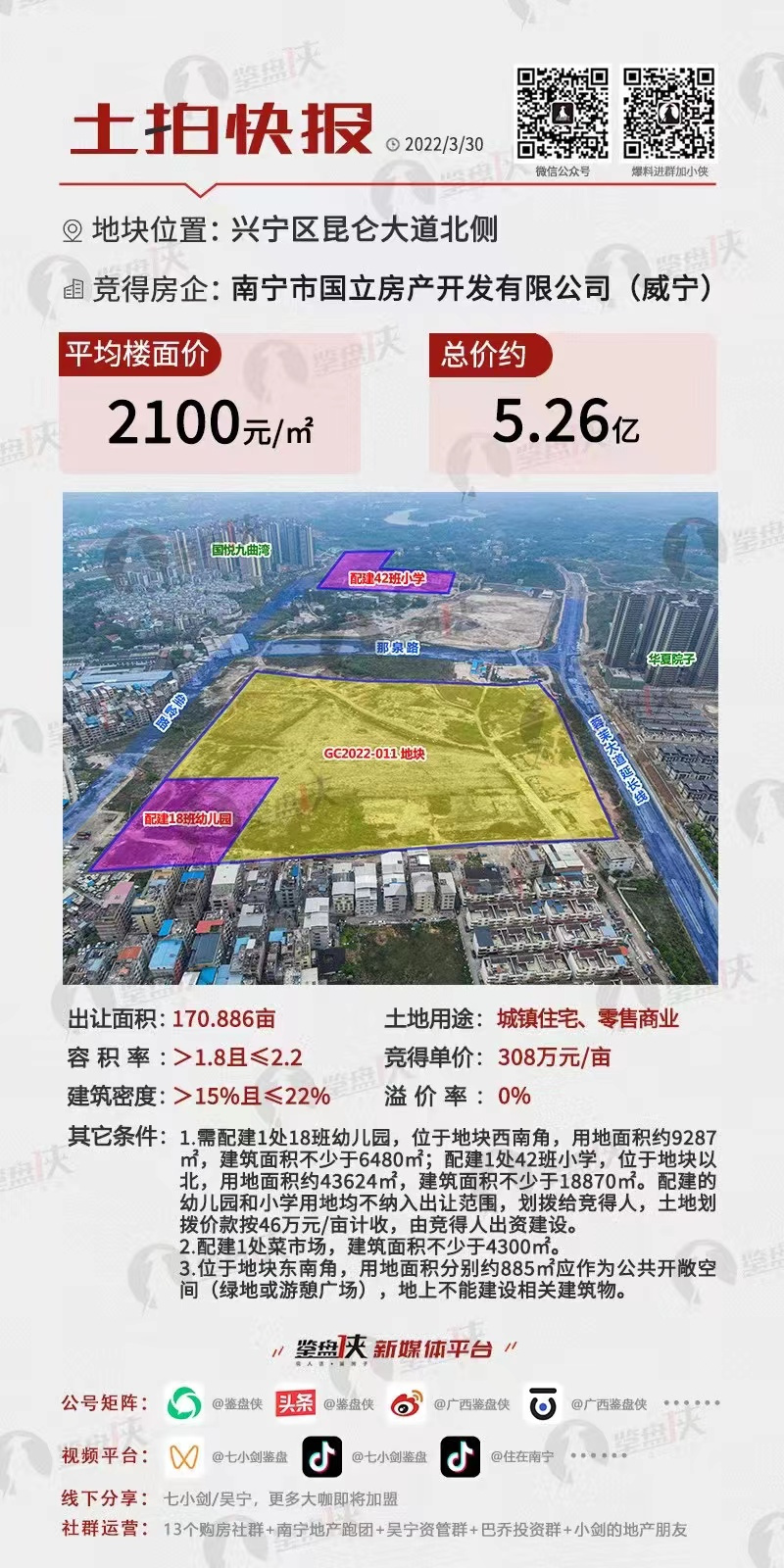 2022年3月30日,威寧房地產(chǎn)公司監(jiān)管單位國(guó)立公司以5.26億元成功斬獲南寧市興寧區(qū)昆侖大道北側(cè)地塊,成交單價(jià)308萬(wàn)元/畝,樓面價(jià)2100元/㎡。