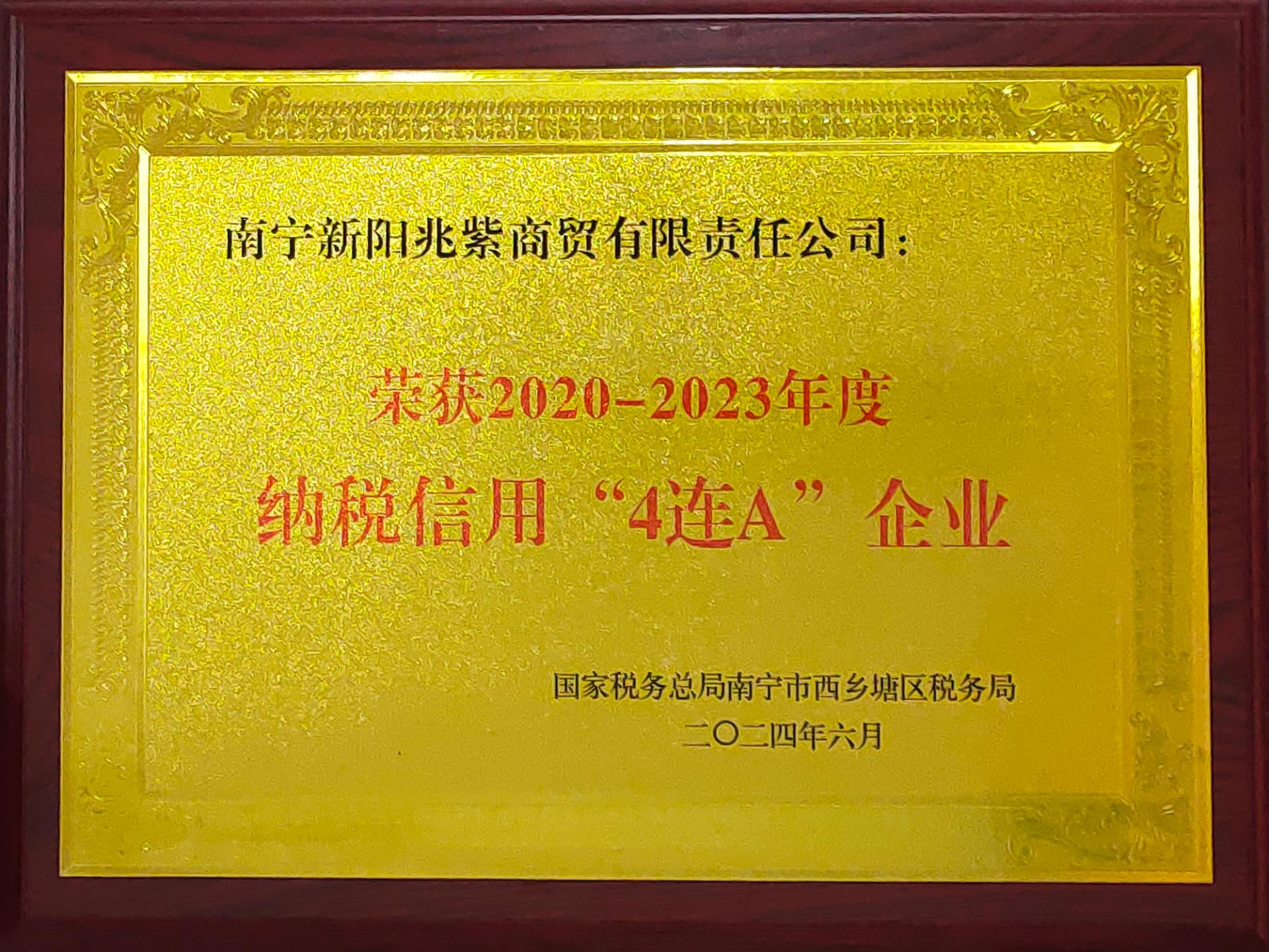 新陽(yáng)兆紫商貿(mào)公司榮獲2020-2023年度納稅信用“4連A企業(yè)”榮譽(yù)稱號(hào)