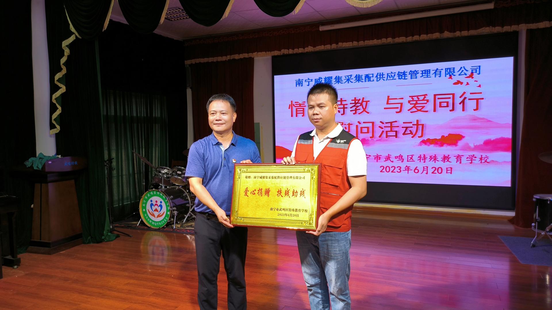 ?6月20日,武鳴區(qū)教育局聯(lián)合威皓供應(yīng)鏈集團(tuán)下屬監(jiān)管單位威耀供應(yīng)鏈公司邕北分公司前往武鳴區(qū)特殊教育學(xué)校開展“情系特教 與愛同行”慰問活動(dòng)。武鳴區(qū)教育局體衛(wèi)藝股股長謝國明,威耀供應(yīng)鏈公司邕北分公司副總經(jīng)理黎世喜參加了慰問活動(dòng)。活動(dòng)前,謝國明前往學(xué)校展覽廳參觀學(xué)生作品和詳細(xì)了解特殊教育學(xué)校發(fā)展歷程、師資配備、特色教學(xué)等情況?;顒?dòng)現(xiàn)場,威耀供應(yīng)鏈公司邕北分公司為特教孩子們分發(fā)粽子、冰淇淋等慰問品,并與孩...