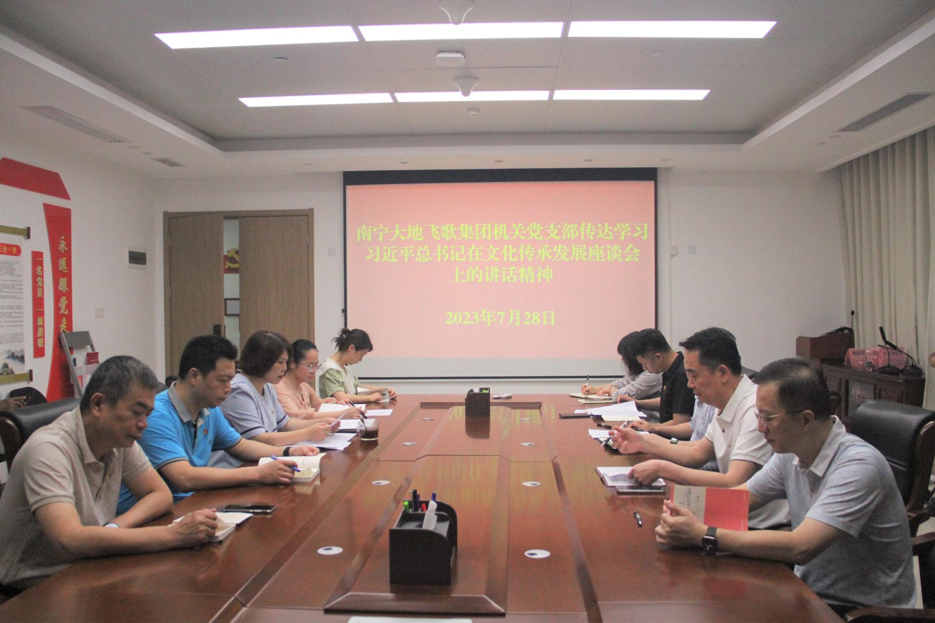 為深入學習貫徹黨的二十大精神,扎實推進基層黨建“五基三化”提升年行動深入開展,2023年7月28日,南寧大地飛歌集團機關(guān)黨支部召開黨員大會,會議由機關(guān)黨支部書記楊青林主持。學講話 揚精神 悟思想。會上,楊青林帶領(lǐng)全體黨員學習習近平總書記在文化傳承發(fā)展座談會上的講話精神。通過學習黨員們一致認為,習近平總書記在文化傳承發(fā)展座談會上的重要講話,著眼于強國建設(shè)、民族復(fù)興,立足于賡續(xù)中華文脈、建設(shè)現(xiàn)代文...