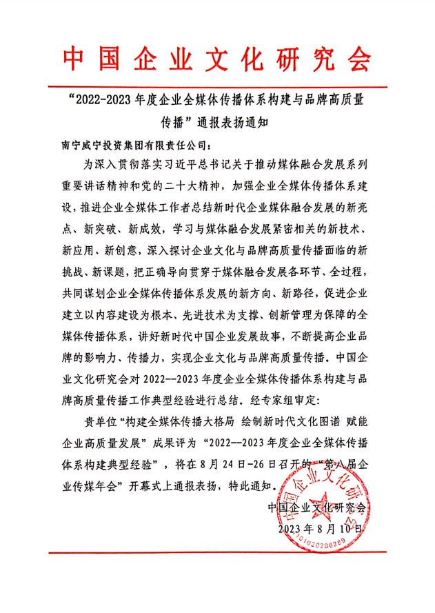 中國企業(yè)文化研究會于2023年8月24日-26日在山東省泰安市舉辦“加強全媒體傳播體系建設(shè),實現(xiàn)品牌高質(zhì)量傳播---第八屆企業(yè)傳媒年會”。南寧威寧集團《 構(gòu)建全媒體傳播大格局 繪制新時代文化圖譜 賦能企業(yè)高質(zhì)量發(fā)展》成果被評為“2022-2023年度企業(yè)全媒體傳播體系構(gòu)建典型經(jīng)驗”并在會上通報表揚。據(jù)了解,面對輿論生態(tài)、媒體格局、傳播技術(shù)的深度變革,南寧威寧集團通過借助“全程媒體、全息媒體、全員媒體、全效媒體...