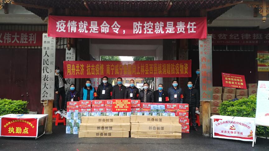 2020年2月12日,細(xì)雨不斷,大霧蒙蒙,一輛滿載著防疫物資的貨車停在了上林縣西燕鎮(zhèn)人民政府,南寧威寧集團(tuán)黨委副書記馬超毅與后盾單位威寧房地產(chǎn)公司、威寧市場公司將價(jià)值1萬元的帳篷、方便面、礦泉水等防疫物資送到了西燕鎮(zhèn)黨委書記韋伯永手中,援助扶貧村抗擊疫情。
