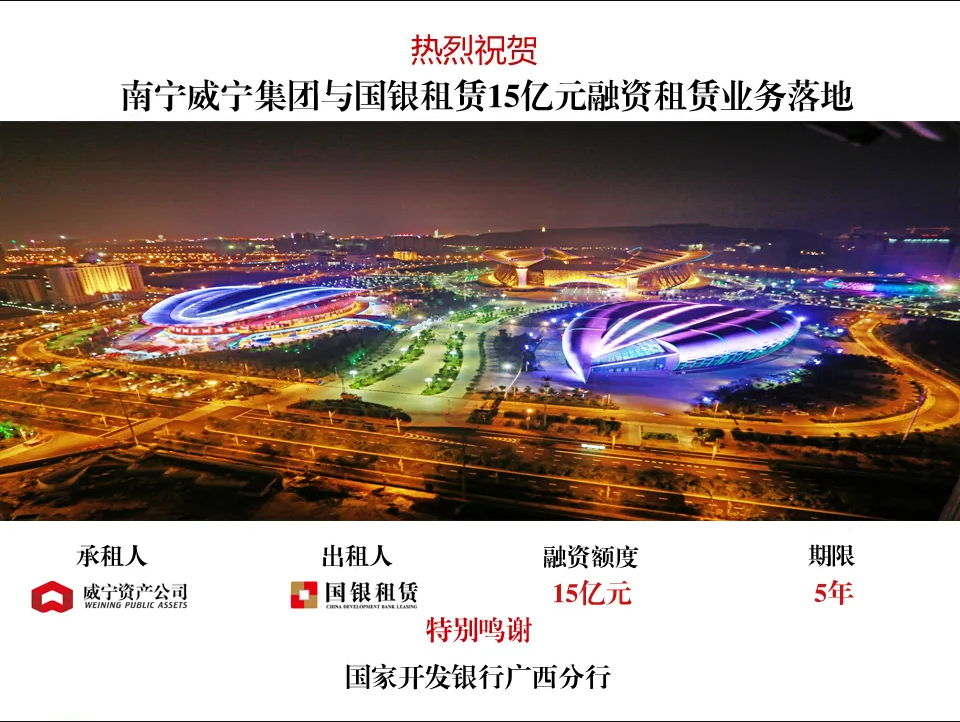 2020年4月27日,南寧威寧集團(tuán)與國銀租賃五年期、15億元融資租賃(售后回租)業(yè)務(wù)完成協(xié)議簽訂并成功首次提款3.5億元,剩余額度將根據(jù)資金需求分批次提款。這是南寧威寧集團(tuán)繼與交銀租賃、招銀租賃、浦銀租賃、外貿(mào)租賃成功合作后再次獲得國內(nèi)主流大型金融租賃機(jī)構(gòu)的大力支持,表明了金融機(jī)構(gòu)對集團(tuán)償債能力以及未來改革發(fā)展持續(xù)向好的充足信心。