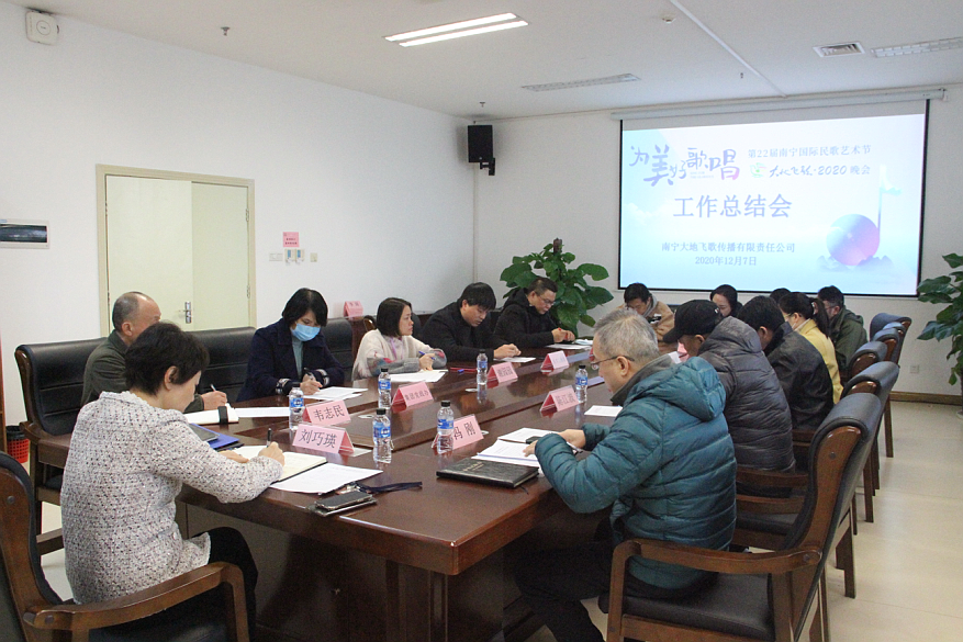 晚會工作總結(jié)會現(xiàn)場近日,南寧大地飛歌文化傳播有限責(zé)任公司召開第22屆南寧國際民歌藝術(shù)節(jié)“大地飛歌·2020”晚會(以下簡稱“晚會”)工作總結(jié)會,對晚會各項(xiàng)工作進(jìn)行全面梳理總結(jié),并結(jié)合當(dāng)前市場趨勢討論下一年度工作發(fā)展計(jì)劃。集團(tuán)黨委副書記書記、總經(jīng)理劉巧瑛出席會議。會上,大地飛歌集團(tuán)公司各部門負(fù)責(zé)人就晚會各項(xiàng)工作進(jìn)行了總結(jié),詳細(xì)分析晚會工作中存在的問題和不足,提出了意見建議。同時結(jié)合當(dāng)前市場融合線上線