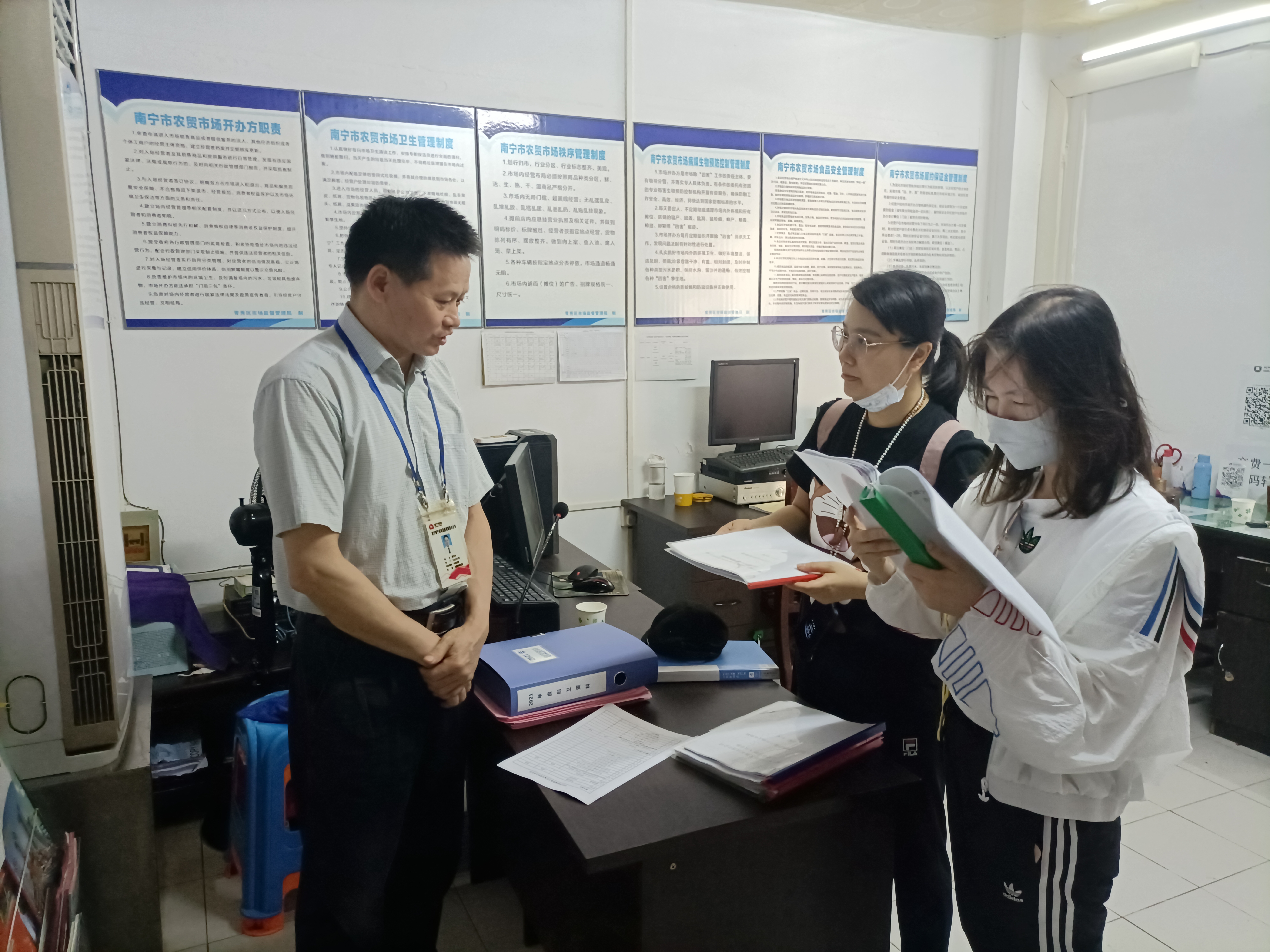 督查現(xiàn)場2021年5月28日下午,南寧威寧集團黨委副書記馬超毅帶隊到威寧市場公司經(jīng)營管理的星湖農(nóng)貿(mào)市場開展創(chuàng)“雙城”指導檢查。檢查中,馬超毅實地查看了市場公益廣告設置、宣傳氛圍營造、市場巡查管理、垃圾分類、創(chuàng)“雙城”工作臺賬及相關制度公示等工作。馬超毅對星湖農(nóng)貿(mào)市場創(chuàng)“雙城”工作開展及市場衛(wèi)生情況給予肯定。他強調(diào),威寧市場公司要繼續(xù)保持良好的工作干勁,全面鞏固綜合治理成果,加強市場保潔,嚴格對標對